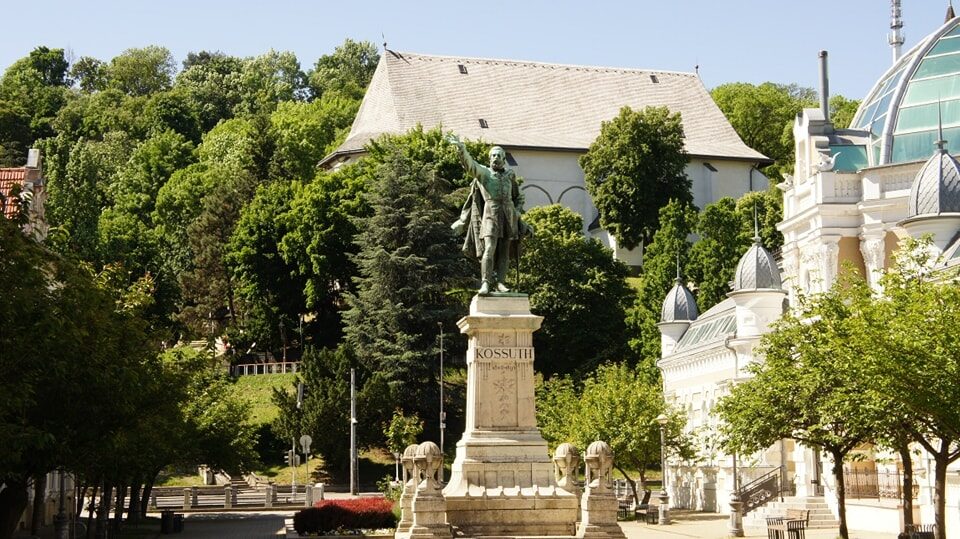 Z Szent István tér krótko deptakiem kierujemy się na Erzsébet tér czyli plac Elżbiety. Przy placu mieszczą się termy o tej samej nazwie, mało znane i niezbyt oblegane ze względu na popularność term jaskiniowych w Tapolca. Budynek z zewnątrz wygląda okazale, zaraz obok pomnik Kossuth Lajos’a, a w tyle na wzgórzu wznosi się kościół reformatorski. Na początku w ogóle nie mieliśmy w planach wspinaczki na to wzgórze, ale ten widok nas skusił.