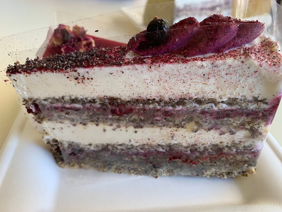 Jest to nieco chrupiący biszkopt z mąki migdałowej z makiem przełożony kremem z białej czekolady ze wsadem z cierpkiej czarnej porzeczki, a to wszystko posypane prażonym sezamem. Dla twórcy ciasto przypomina o czasie spędzonym w ogrodzie u babci na zrywaniu porzeczek oraz cieście makowym, którym go częstowała.